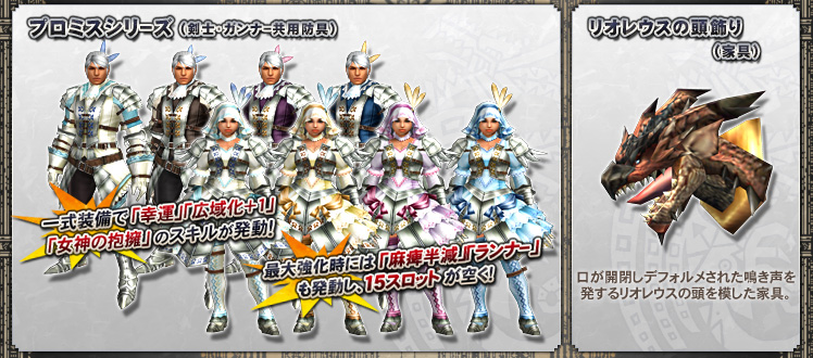 「プロミスシリーズ」(剣士・ガンナー共用防具) 一式 ※生産券1つにつき1部位生産可能です。 ※「プロミスシリーズ」は剣士・ガンナー共用の防具です。 ※「プロミスシリーズ」は男性キャラクターの場合は男性用、 女性キャラクターの場合は女性用、どちらか1つのみ入手 することができます。 |